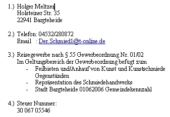 Zu meiner Person:Ich heiße Holger Meltzer und bin ein Schmied aus Leidenschaft. Gelernt hatte ich einmal Kfz-Mechaniker bei VW in Bargteheide. Später bestand ich in Hamburg meine Meisterprüfung. Ich war ein begeisterter Motorsportler und als Hobby schraubte ich als Rennmechaniker. Erst Rallyes wie z.B. Sachs-Ralley-Baltic, Wolfsburg-Travemünde, Wiking-Rallye um nur einige zu nennen. Dann Rallye-Cross, wie z. B. in Buxtehude. Dann Langstreckenpokal auf dem Nürburg Ring und 24 Stunden Rennen auf dem Nürburgring. Dann nahm die Elektronik im Kfz. überhand und ich zog mich 1995 aus dem Schrauberleben zurück und lernte bei Detlef Moor in Lauenburg Schmied. Das ich inzwischen 37 Jahre "alt" war, störte mich nicht. Ich war Lehrling und lernte den neuen Beruf von der Pike auf. In Berlin legte ich die Gesellenprüfung ab. Hier in Berlin konnte ich mich in meinem neuen Beruf vervollständigen und unter verschiedenen Meistern sehr viel lernen. Diese Lehrzeit war die schönste Zeit in meinem Leben. Ich bin viel herumgekommen, und habe z.B. in 30 Arbeitjahren bei 27 verschiedenen Firmen gearbeitet !! In Unterschiedlichen Berufen. Meinen Beruf als Schmied betreibe ich als Nebengewerbe. Hauptberuflich arbeite ich als Feinmechaniker in einem mittelständischem Betrieb ( D +H Mechatronic AG ) in der Nähe von Hamburg.